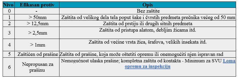 Tabela u nastavku prikazuje skalu zaštite od čvrstih predmeta: